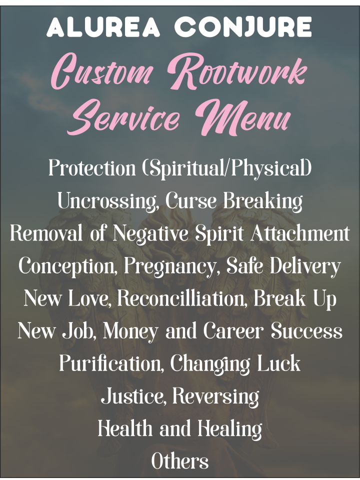 This listing is for customised rootwork unique to your case. I will make a diagnosis regarding the problem you are facing, advise and perform the spiritual work accordingly. This may include doing a spell, petitioning a specific saint/archangel/deity/spirit/ascended master, or both.