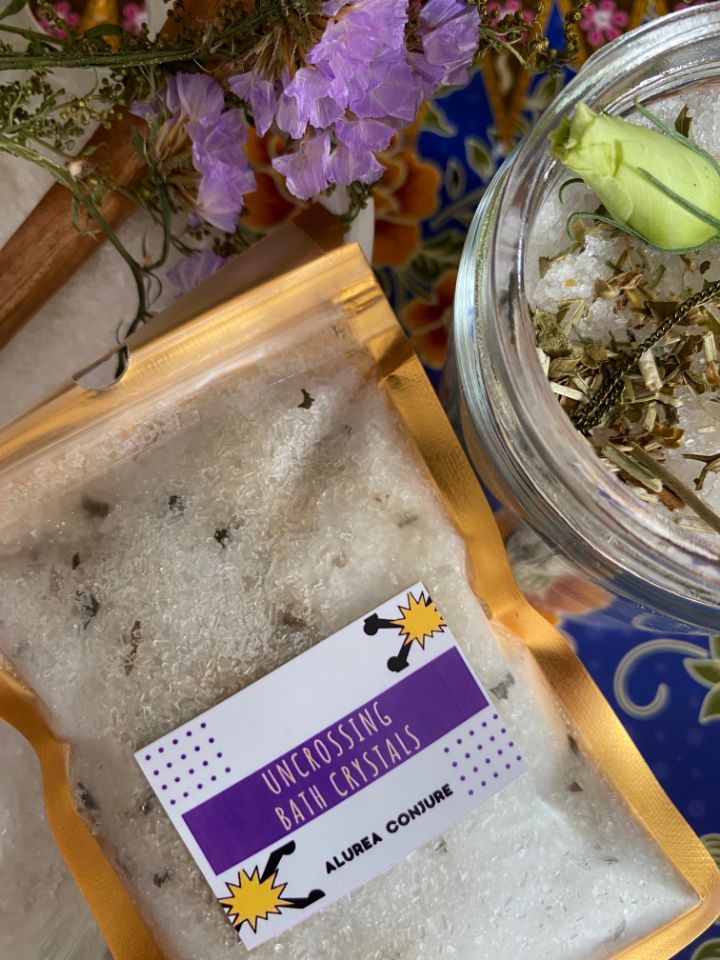 Steep the bath crystals in hot water. Then strain the herbs and add the water into the bath. Wash upward to attract and downwards to repel while praying for your intentions. When the bath is completed, air dry instead of using the towel.
